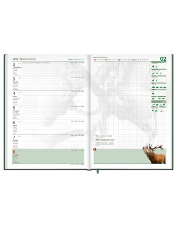 Łączy funkcjonalność z estetycznym wykonaniem, oferując idealne narzędzie do organizacji sezonu łowieckiego. W formacie B5 (17 x 23,5 cm) zawiera przejrzysty układ tygodniowy z miejscem na notatki, co ułatwia planowanie polowań i codziennych zadań.